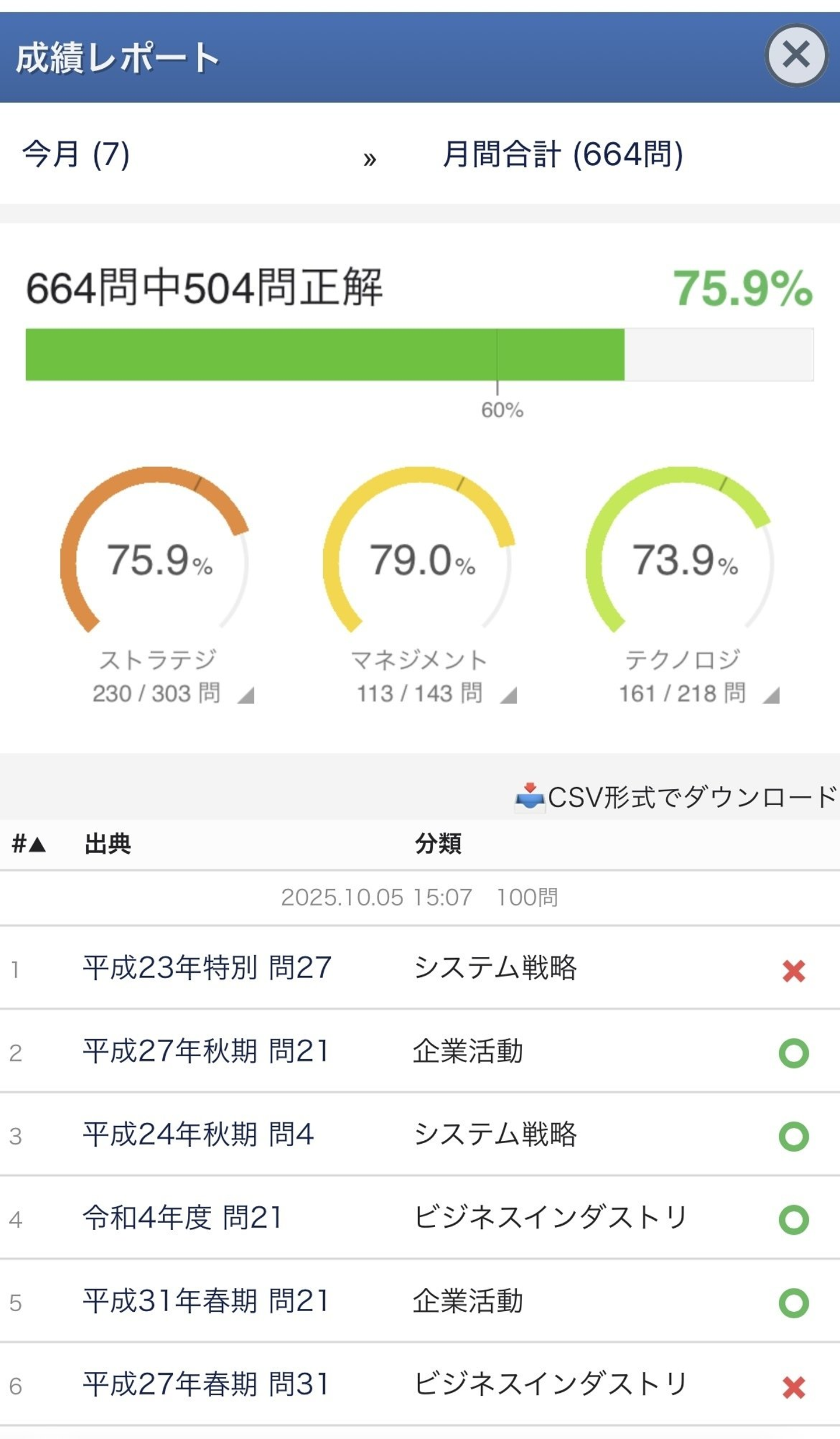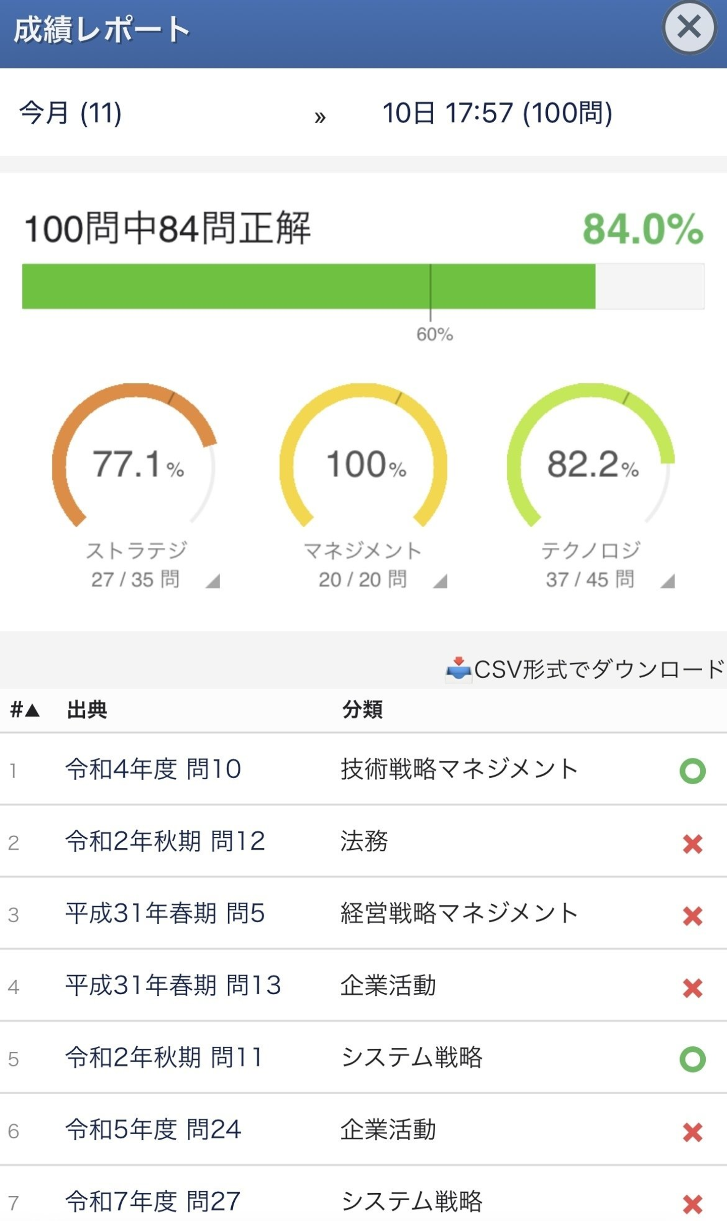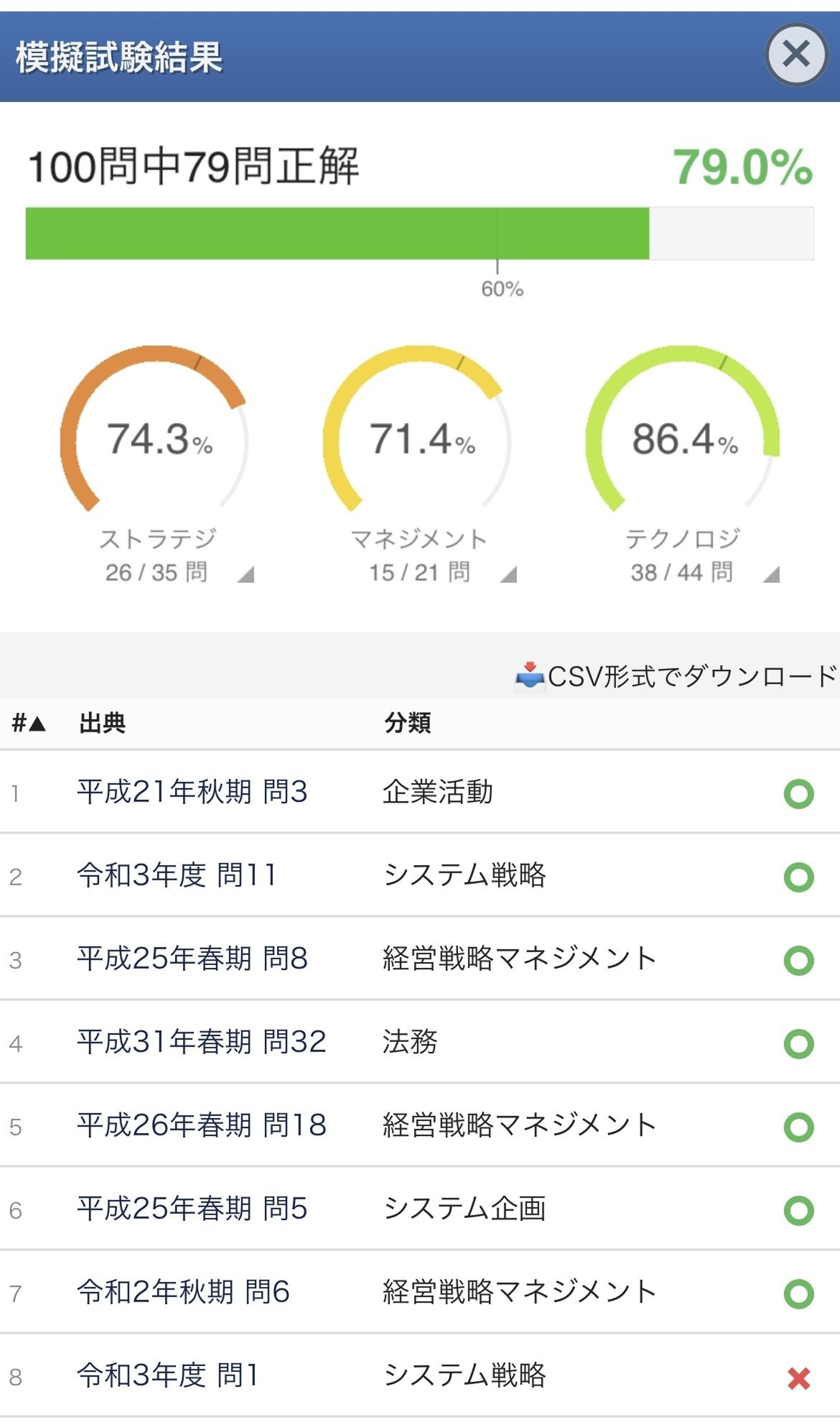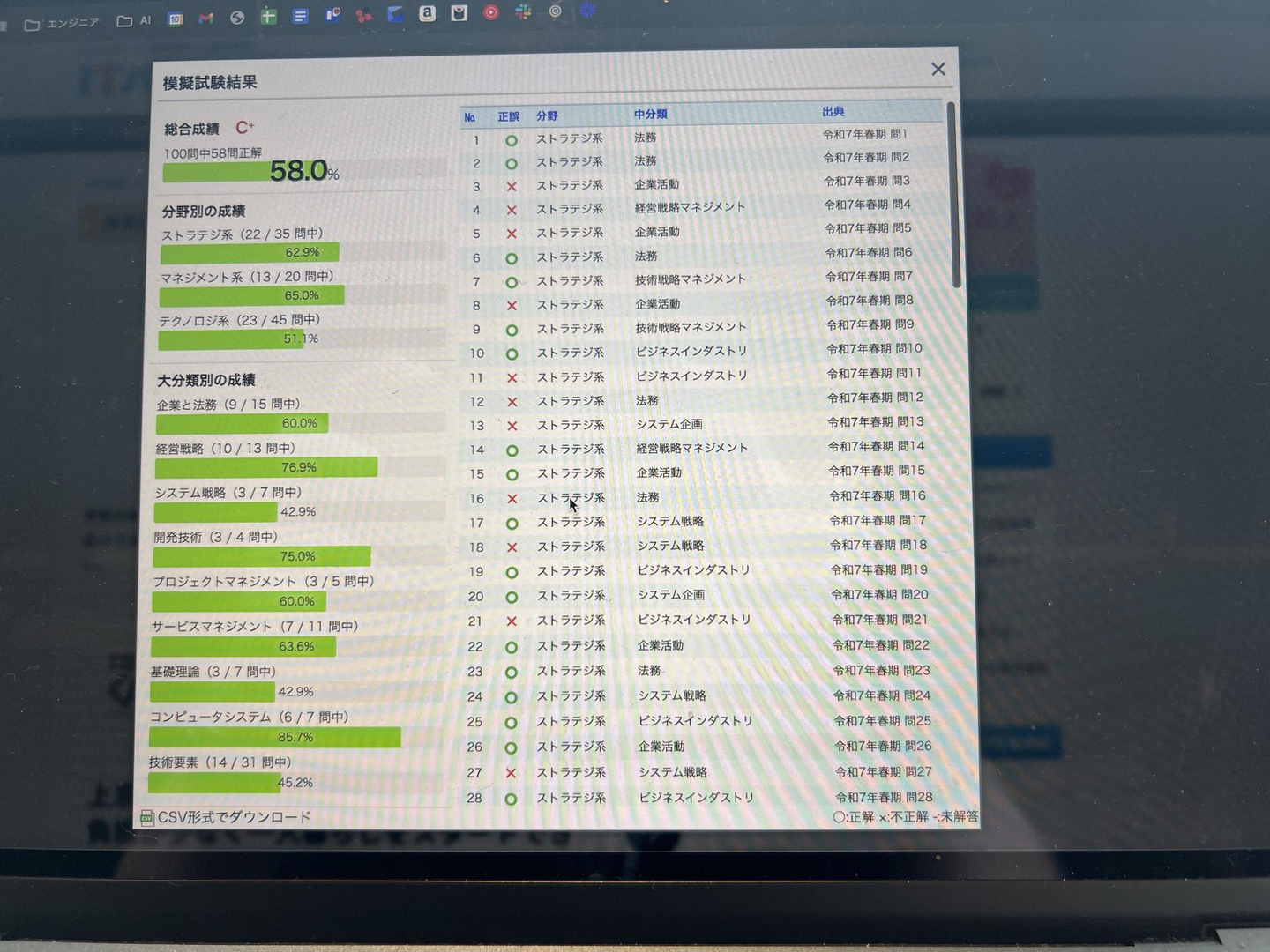 ビジネスサイドの知識や経験を持っていたこともあって、ストラテジ分野の知識は最初から問題なく合格圏内に入っていました。