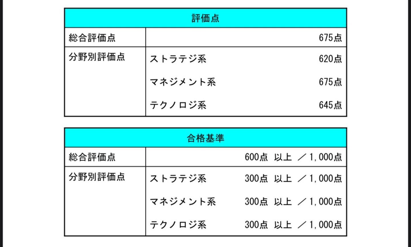 - 合格基準:総合評価点600点以上(1000点満点中)+ 各分野(ストラテジ・マネジメント・テクノロジ)ごとに300点以上が必要。