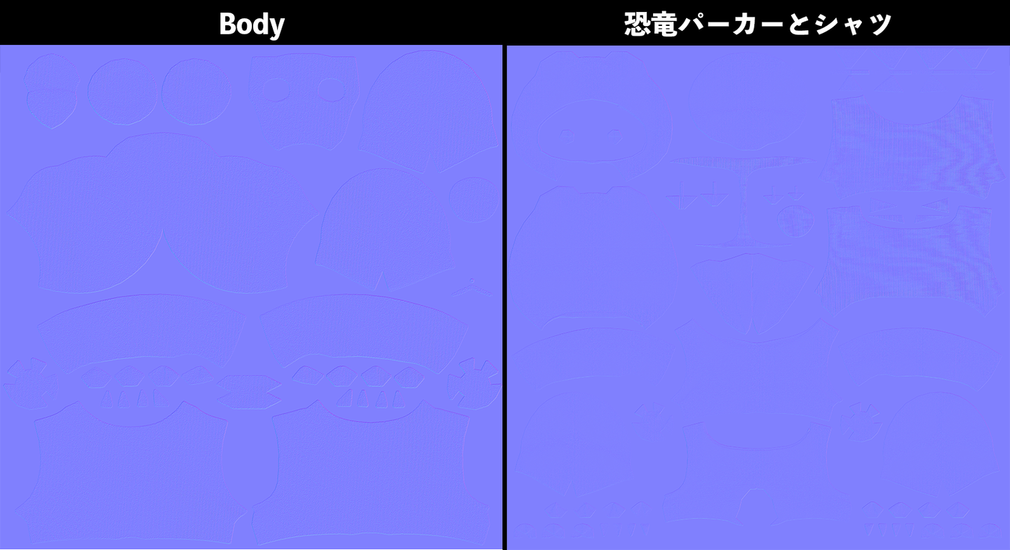 恐竜シャツに関しましては、オブジェクト構成を変更した影響で歩くとパンツのあたりから体のメッシュが貫通するようになってしまったため、服で見えない部分のメッシュはブレンドシェイプで絞るアニメーションを作成しました。