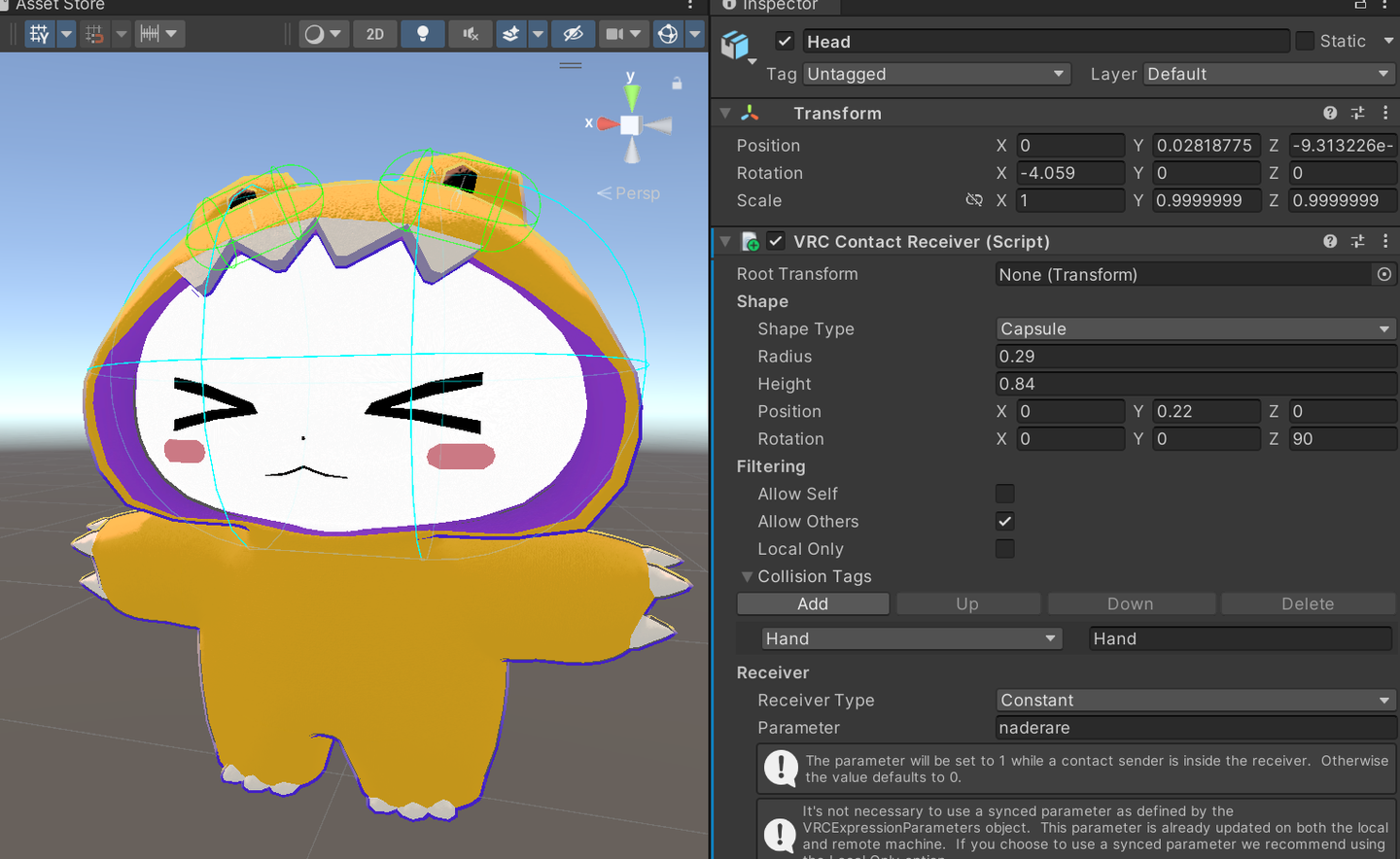 頭にコライダーを設定し、FXコントローラーにも表情の設定を追加しました。