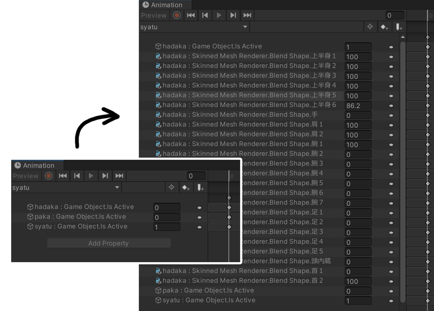 あんちものオブジェクト構成が変わったため、各表情のアニメーション内容の再設定をしました。