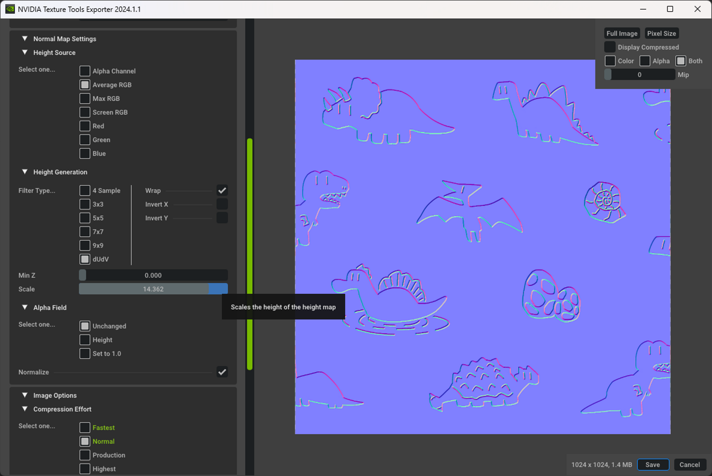 すると新しくウィンドウが表示されるので、Image TypeをNormal map:Tangent Spaceに変更します。凹凸の高さの指定は下のScaleから調整できます。お好みで調整したら右下のSaveをクリックしてください。