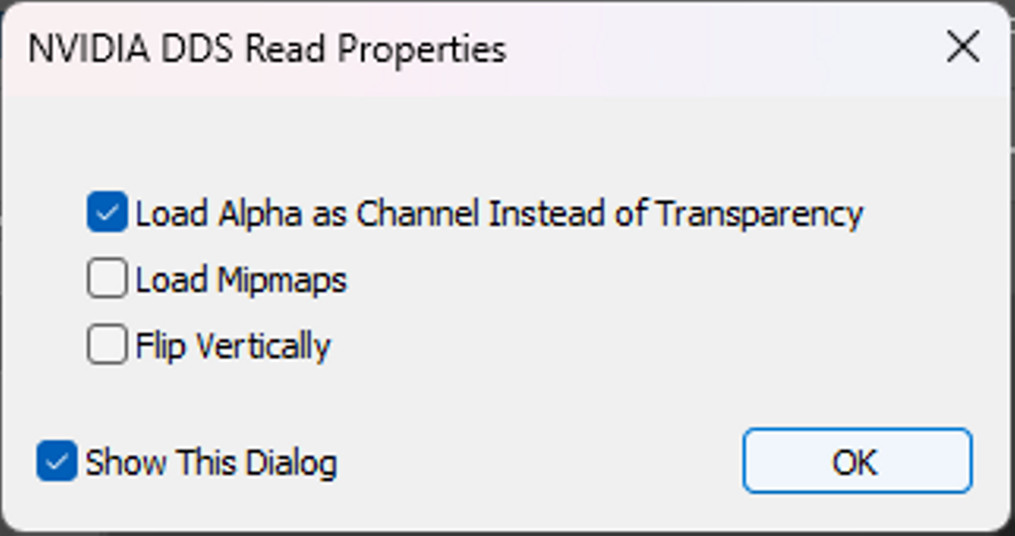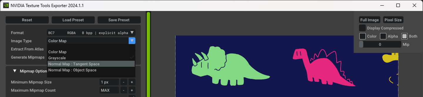 先ほど生成したノーマルマップ画像をPhotoshopで開きなおすとこのようなウィンドウが表示されます。