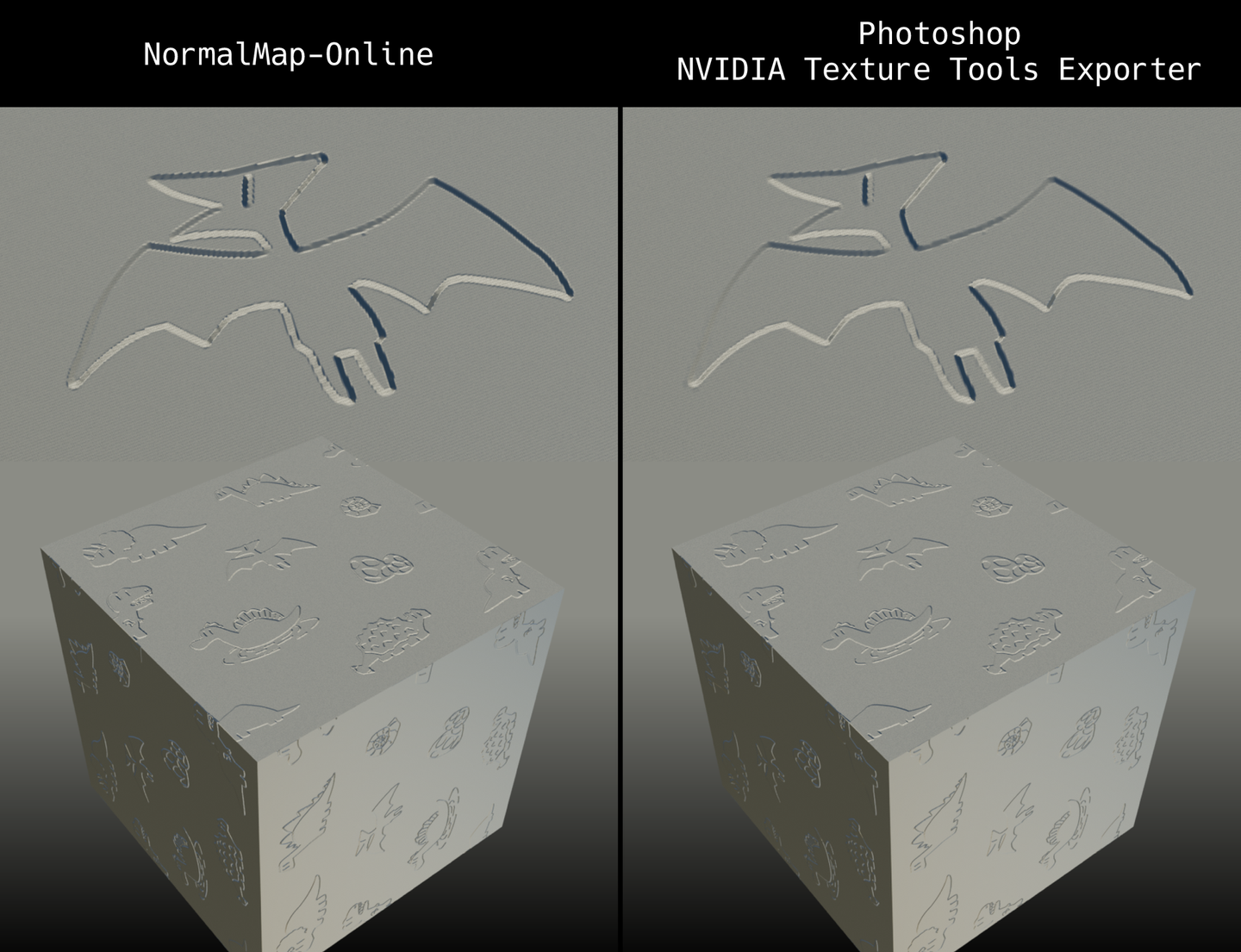NORMAL MAP ONLINEとPhotoshop×プラグインにて作成したノーマルマップを比較してみました。同じキューブオブジェクトに同じ設定のノードを適用しています。