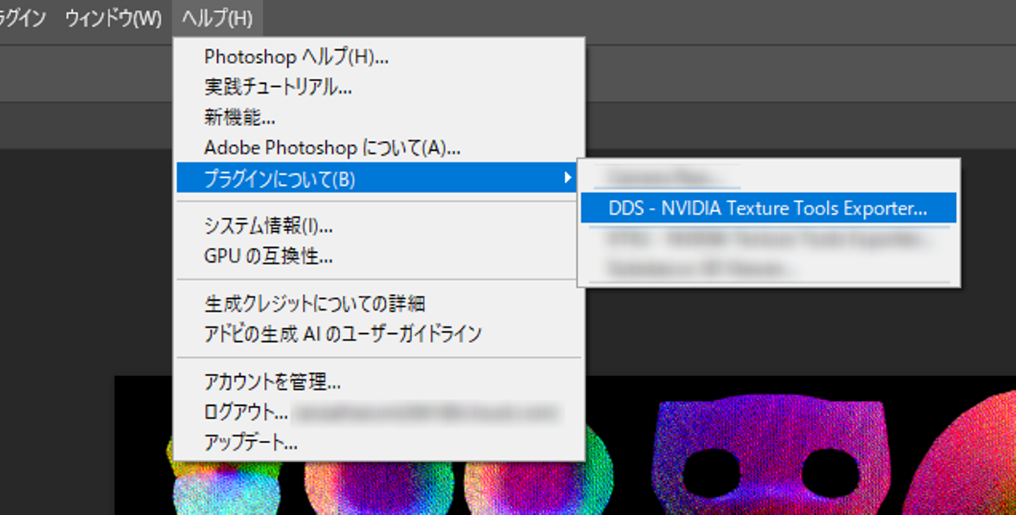 インストールが終わったらPhotoshopを開き、メニューバーのヘルプ→プラグインについてにNVIDIAの名前があるか確認してください。