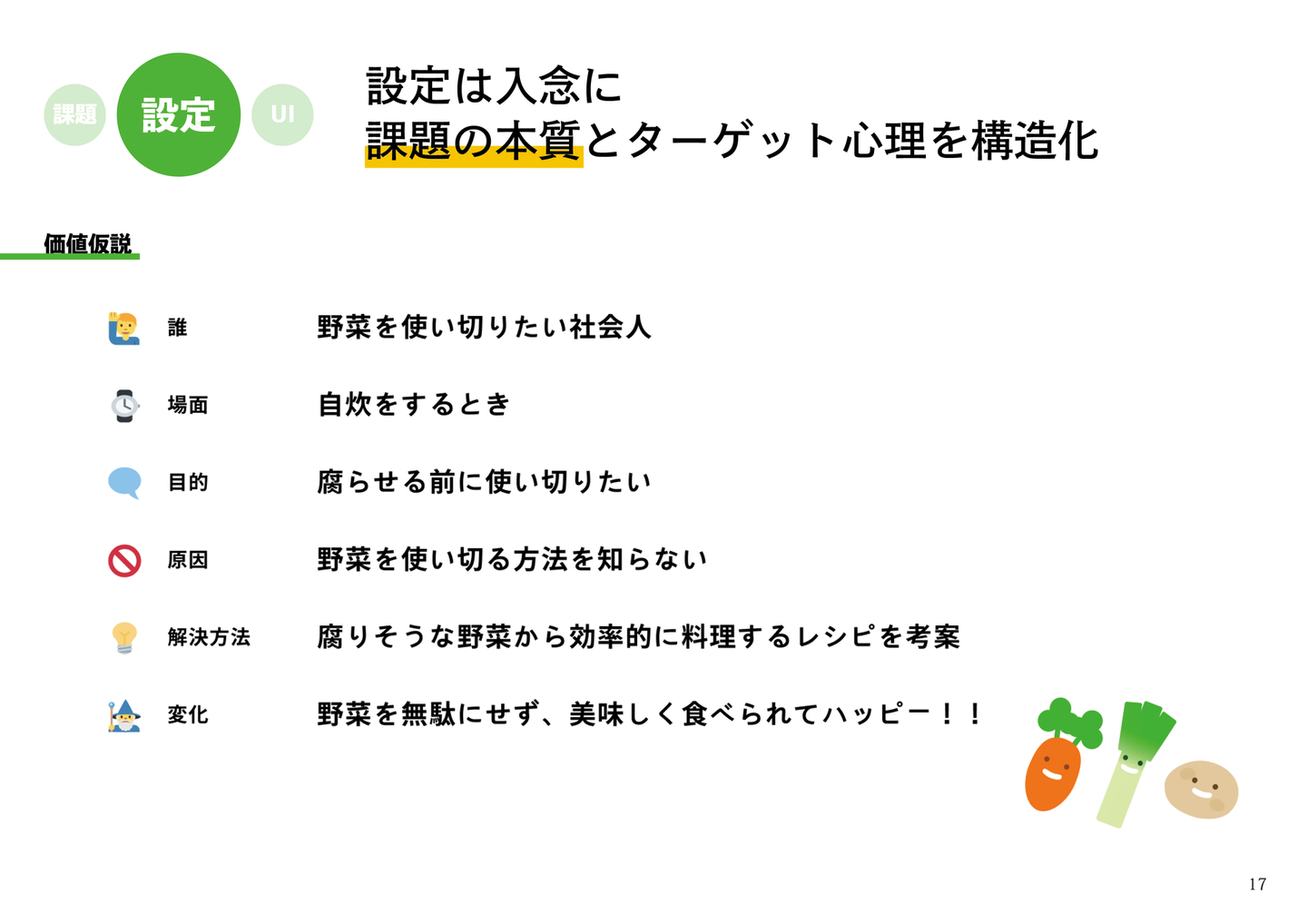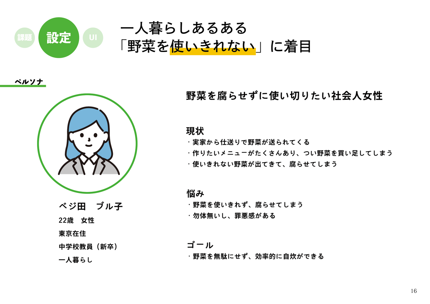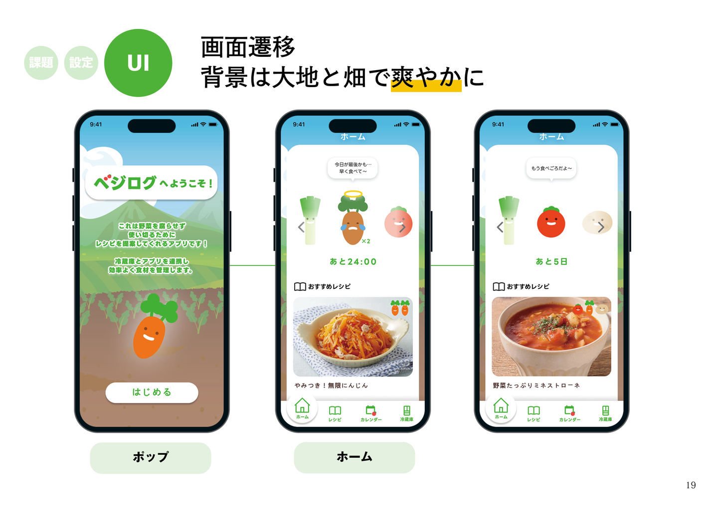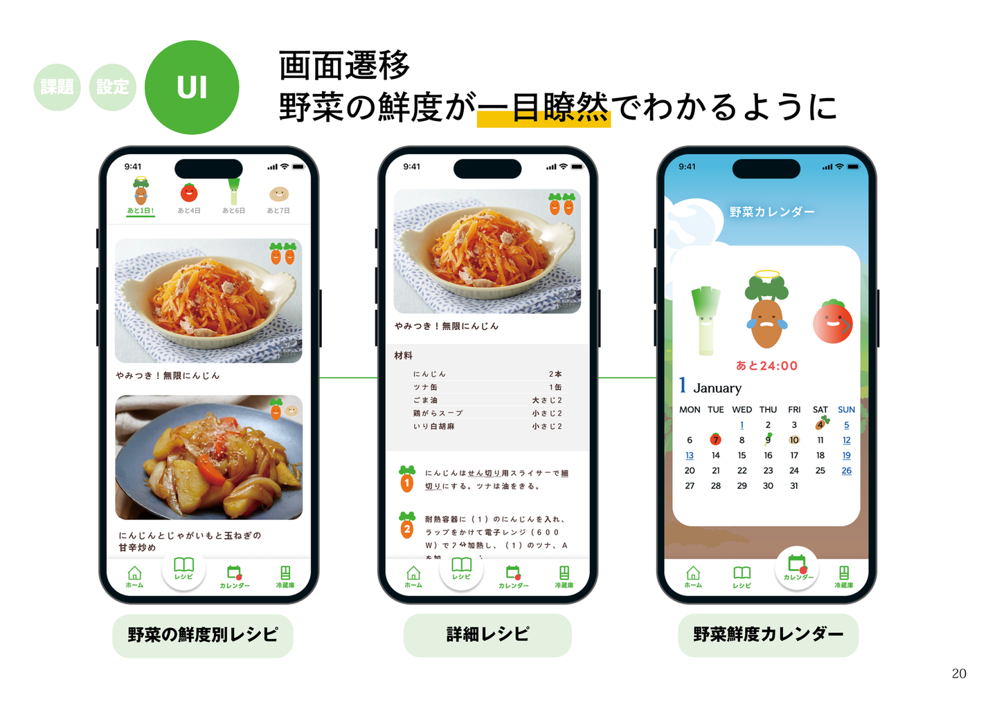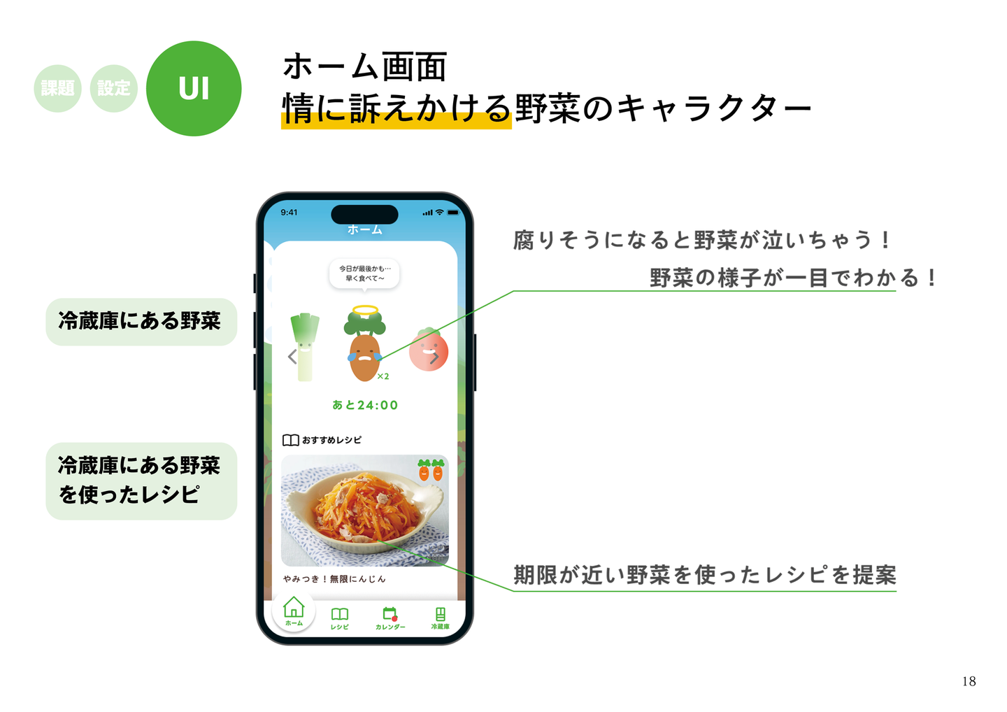 「野菜を腐らせてしまう」という誰にでもある課題に向き合い、野菜を腐らせずに使い切るためのアプリ設計を行った。