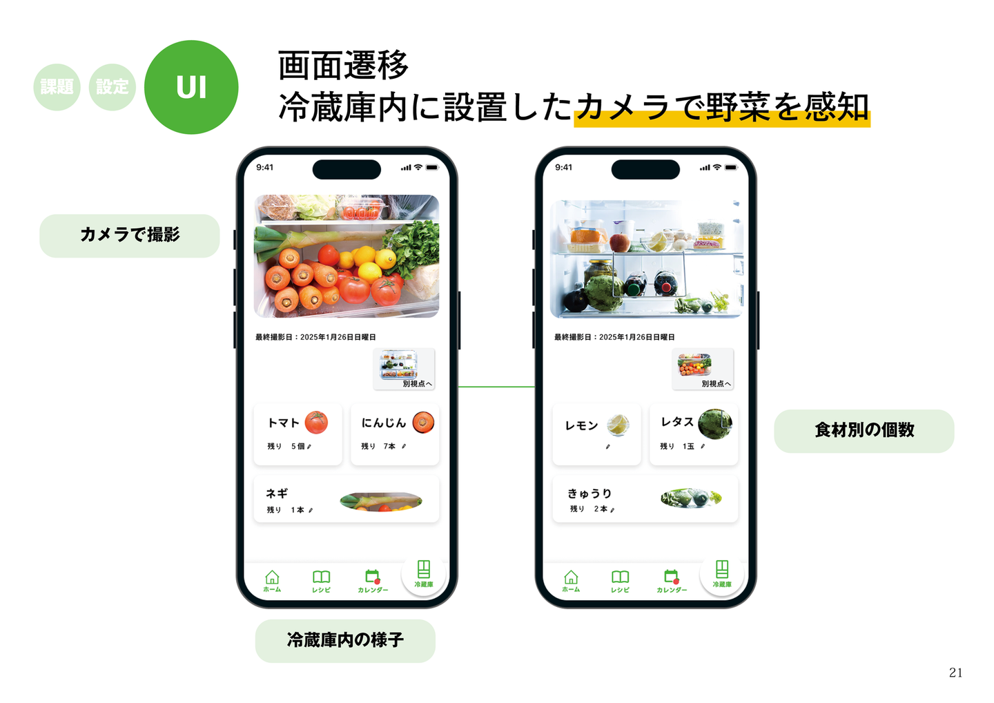 本制作では、冷蔵庫内にカメラを設置し、AIが賞味期限を自動認識するという設定で、アプリ内では以下のことが行える設計になっている。