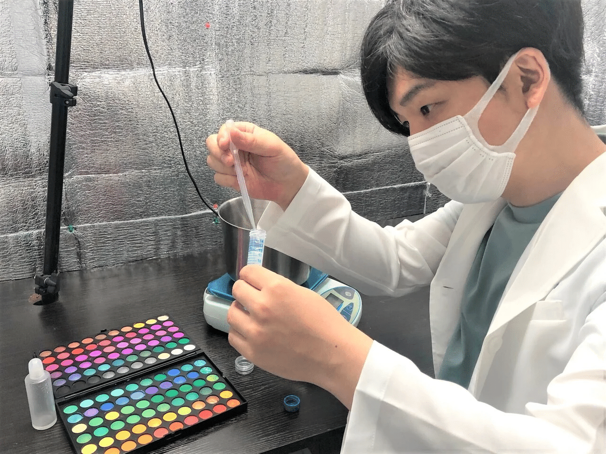 粉物のコスメは、肌に塗る目的で作られているため、汗で落ちないように粉の一つ一つが油でコーティングされています。そんな水に溶けにくい粉物のカラーコスメを水に溶け・うまく分散して・乾いた後に膜になって・万が一肌についてもリスクが低い色材へと変えるのがmagic waterの技術です。