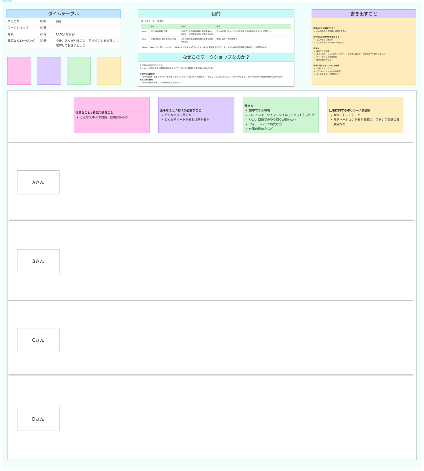 このワークショップは、チームの理解を深めるだけでなく、新しいメンバーが加わったときや、コミュニケーションがぎこちないときにも 1〜2 時間で実施可能です。