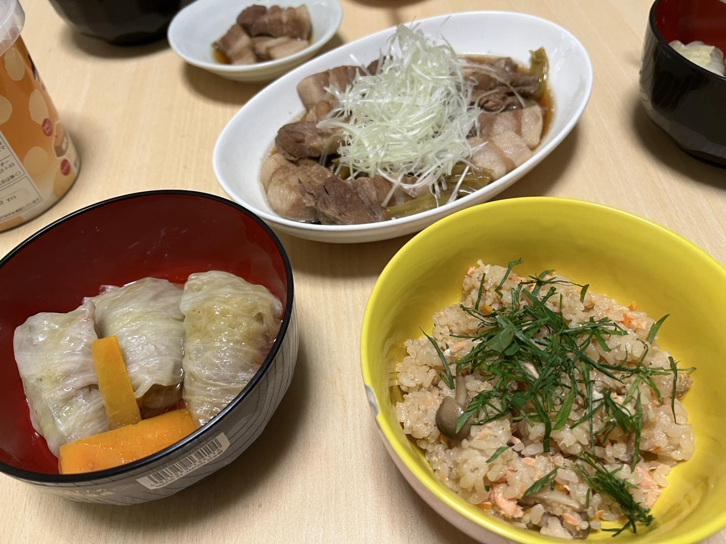 片手間で作った角煮と炊き込みご飯を添えて完成。