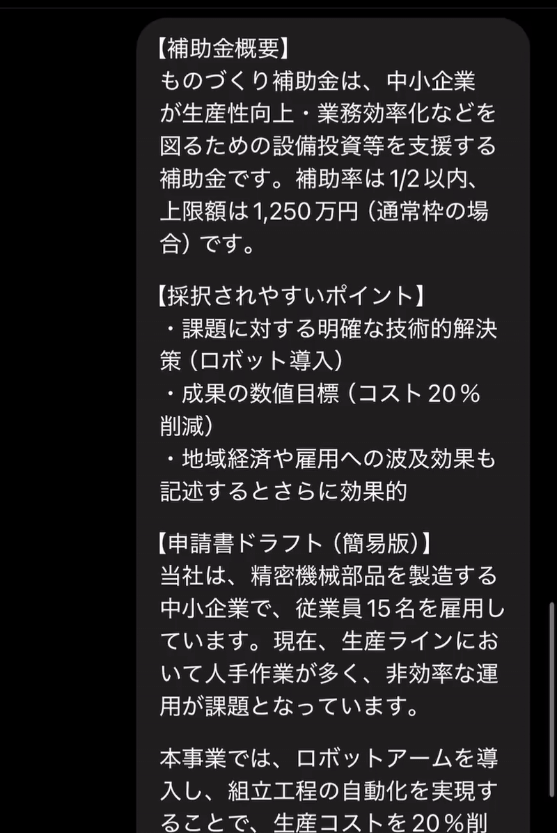 - 申請書ドラフト(目的/計画/効果・波及)を自動生成