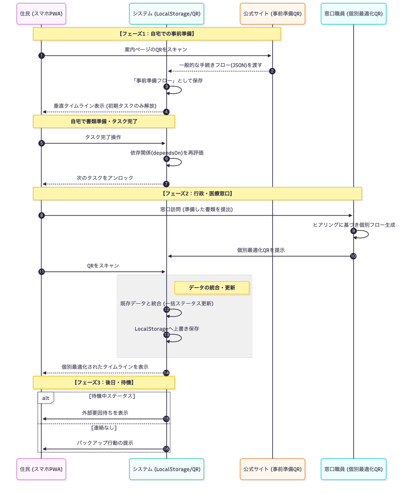 ポイント: 職員と住民がQRコードという「共通の器」でデータをやり取りするフローを定義。これにより、入力の手間を省き、正確な情報をスマホへ届けます。
