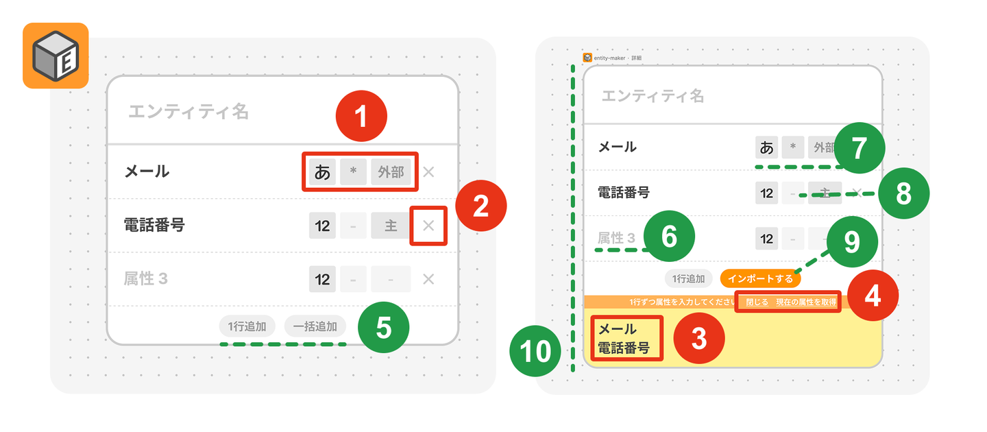 ⑥ 属性の追加時にカラム数がなんとなく把握できるよう、プレースホルダーに連番が表示されるようにしました。