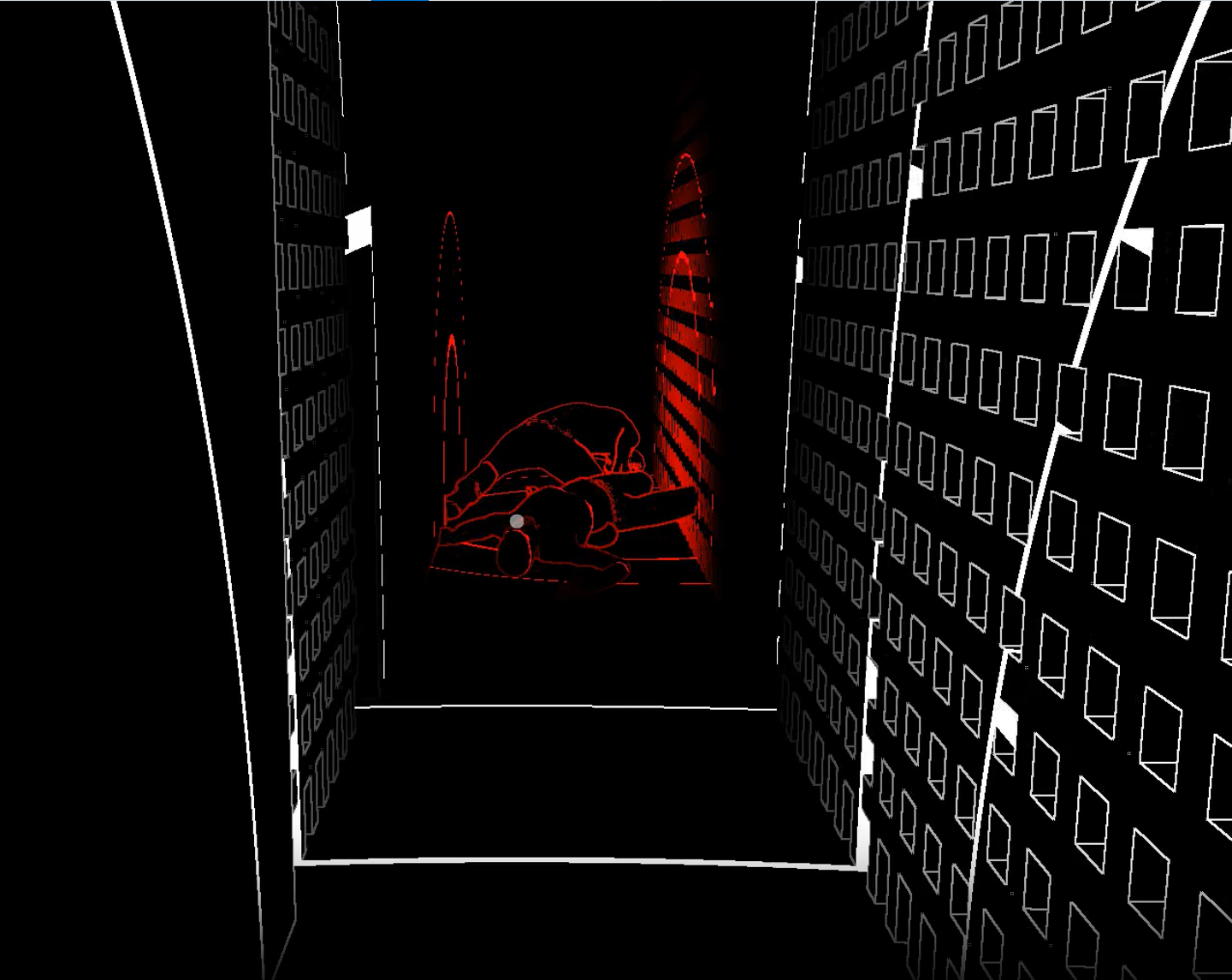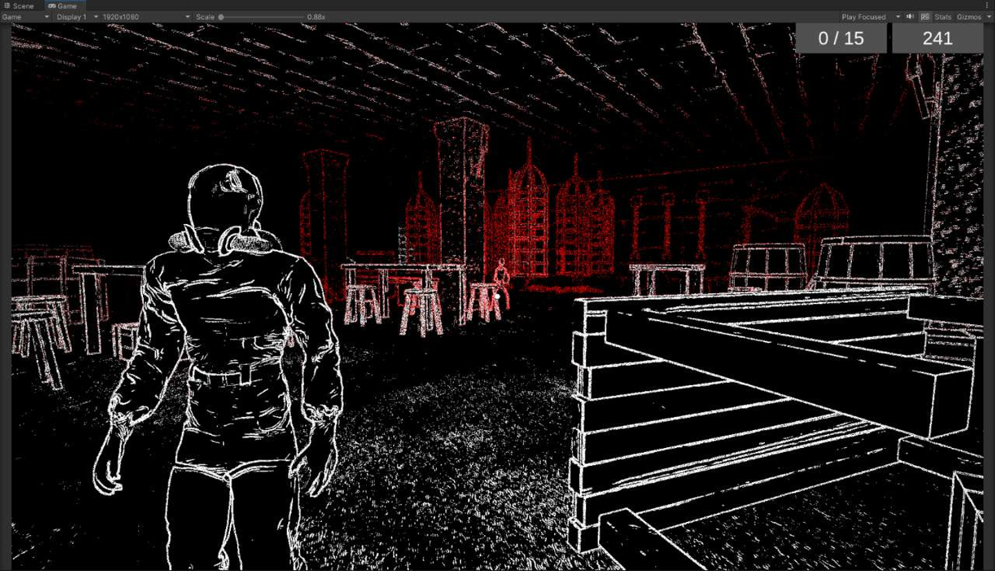 (画面は彼が完成させたステージの一つ。また、このバージョンのビジュアルは前と比べて細かいディティール(テクスチャにあるNormalMapの凹凸)を描写するようにし、遠くの物体は太さ均一でスムーズだった線をノイズ混じりの特殊なぼかし表現に変更した。敵がはっきりとしない輪郭を持つ方がホラーゲームらしいと考えた(EpicのPCゲーム「Saturnalia」に影響を受けている))