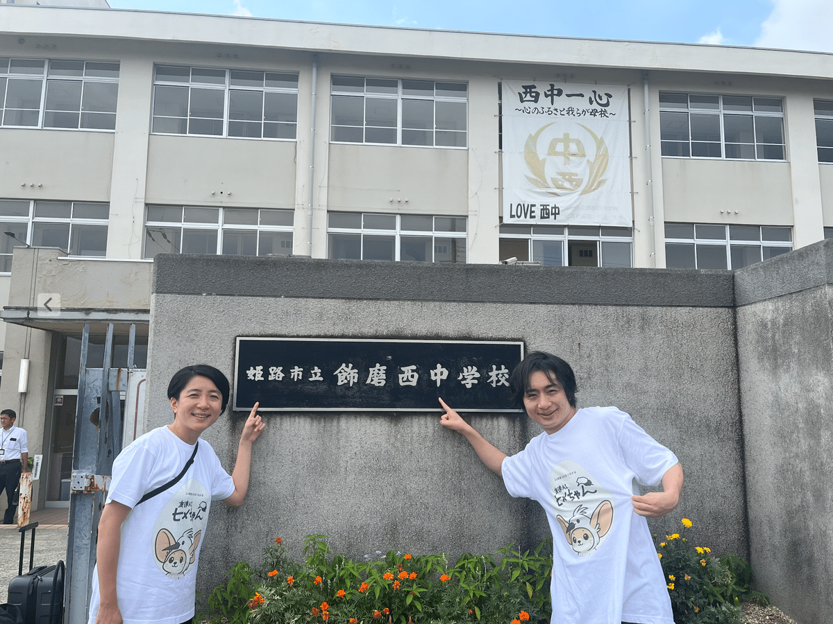 8月29日、ヒメちゃんTシャツを着た僕は、姫路市飾磨西中学校の校門の前に立ちました。