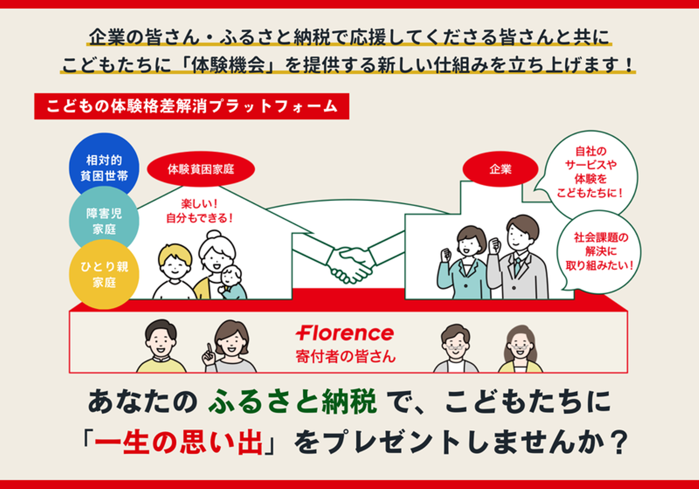 あなたのふるさと納税によって、企業と体験貧困家庭の子どもたちをマッチングするプラットフォームを創りたい。