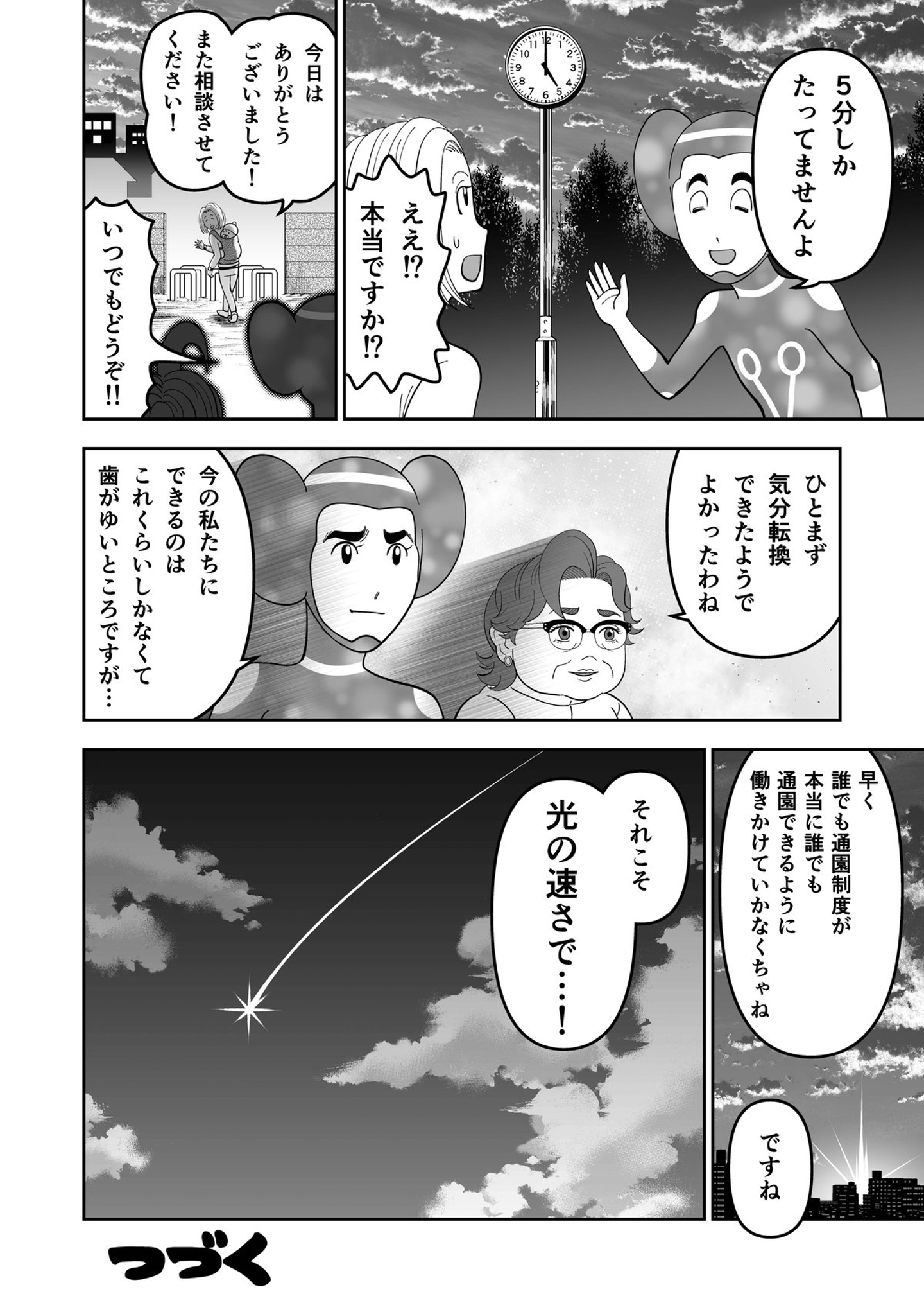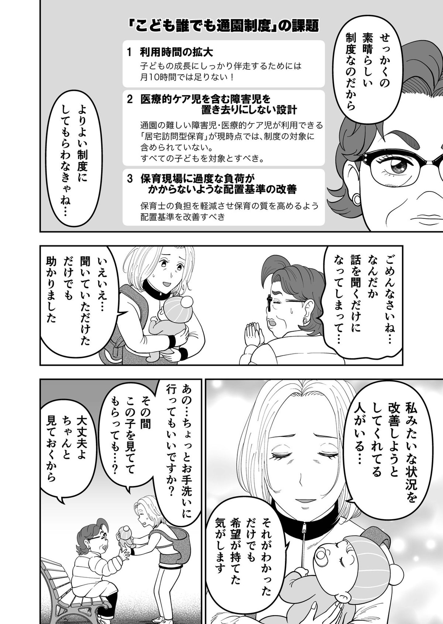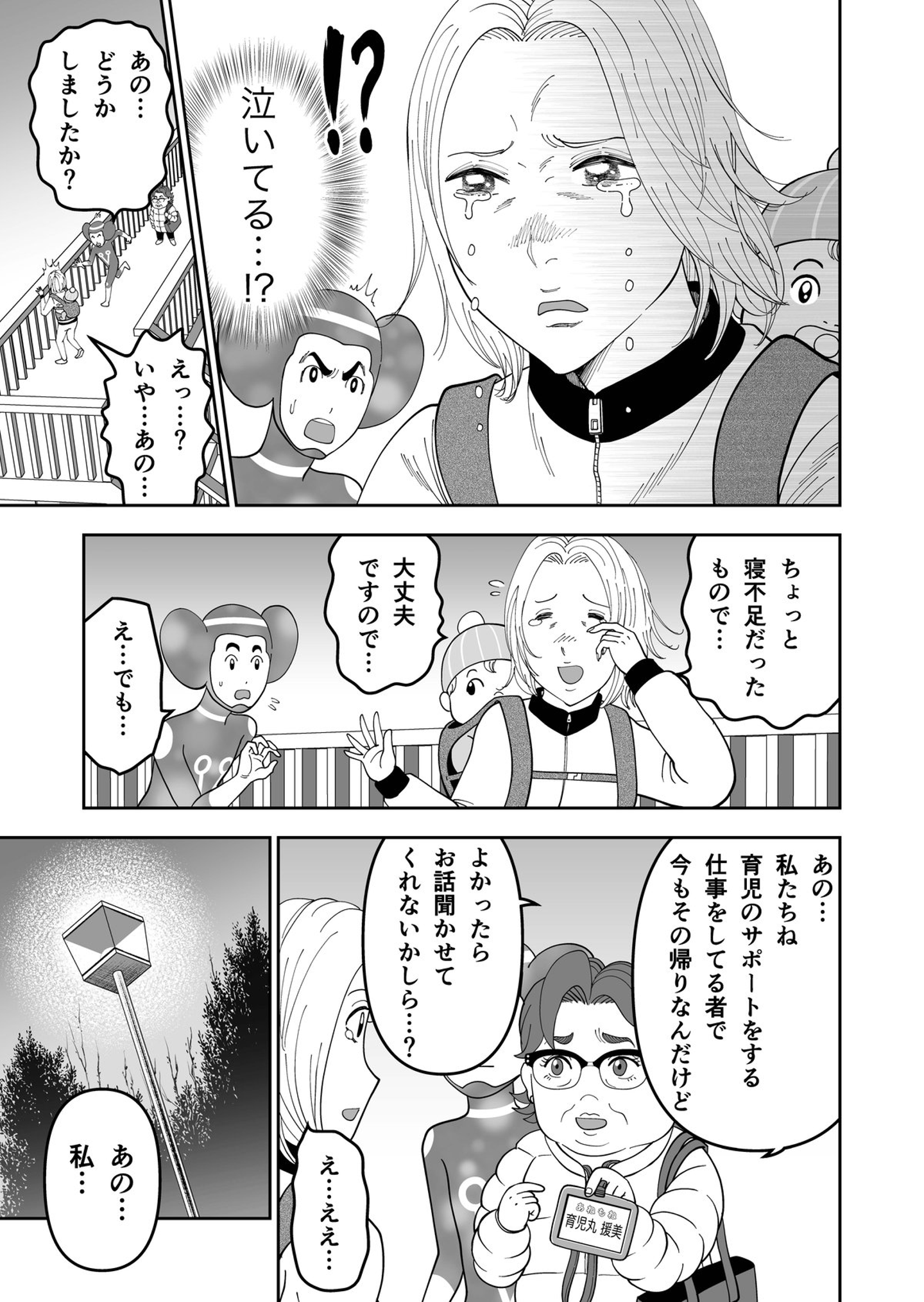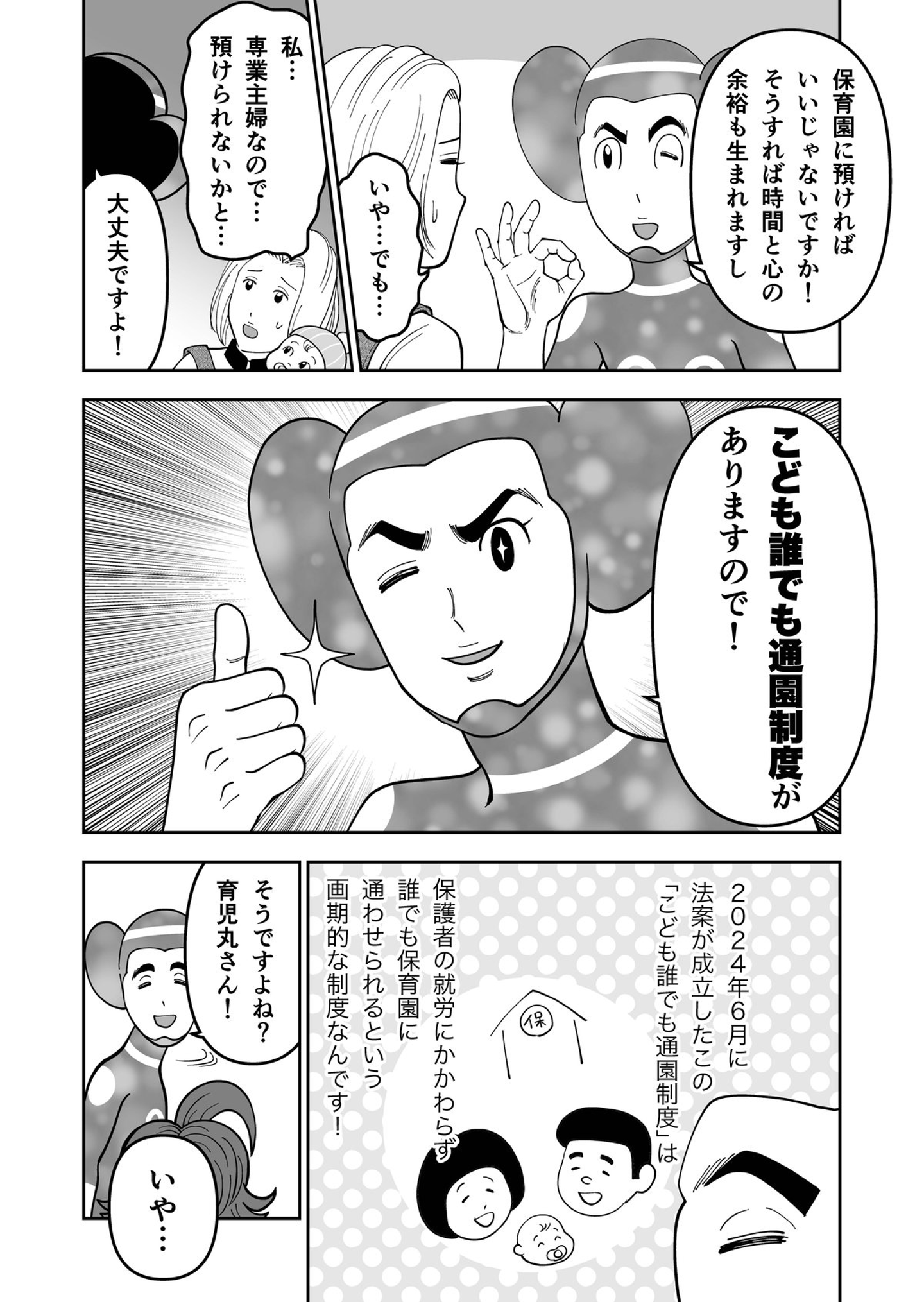 第45話「こども誰でも通園制度とは?」 Hiroki Komazaki CEO on 2025-02-07 僕が原案を担当させてもらっている、子育て支援が学べるギャグマンガ「#子連れ宇宙人パテラさん」待望の最新話公開です!産後の育児に疲れ果てた専業主婦と出会ったパテラさん。息抜きのために保育園の利用を勧めるが……これまでの全連載はこちらでお楽しみいただけます! 子連れ宇宙人パテラさん 月刊誌『第三文明』で好評連載中の漫画「子連れ宇宙人パテラさん」。認定NPO法人フローレンス会長・駒崎弘樹さんが原案をつとめています。 本日1/31から、第45話「こども誰でも通園制度とは?」が公開になりました。 子育てに悩んでいる女性と偶然出会ったパテラさん。誰でも保育園に通えるという制度を紹介するが、じつは課題もあって......。 第45話「こども誰でも通園制度とは?」 Hiroki Komazaki マンガ 保育園 専業主婦 子連れ宇宙人パテラさん こども誰でも通園制度 Share