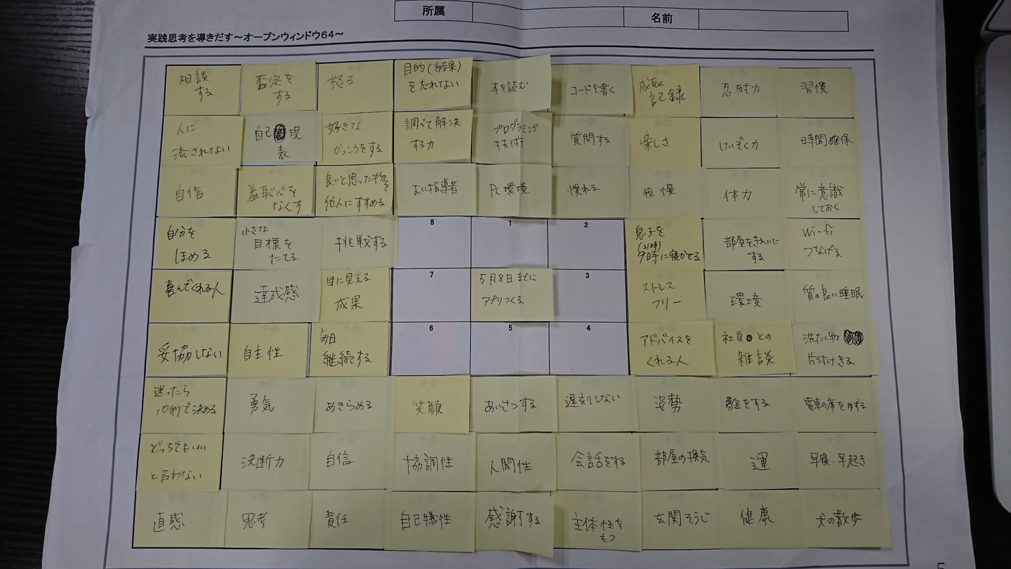 マインドマップも核があってそこから連想させていくのですが、ちょっと違ったのはオープンウィンドウ64では一つの項目について8つ出す。ってところで、