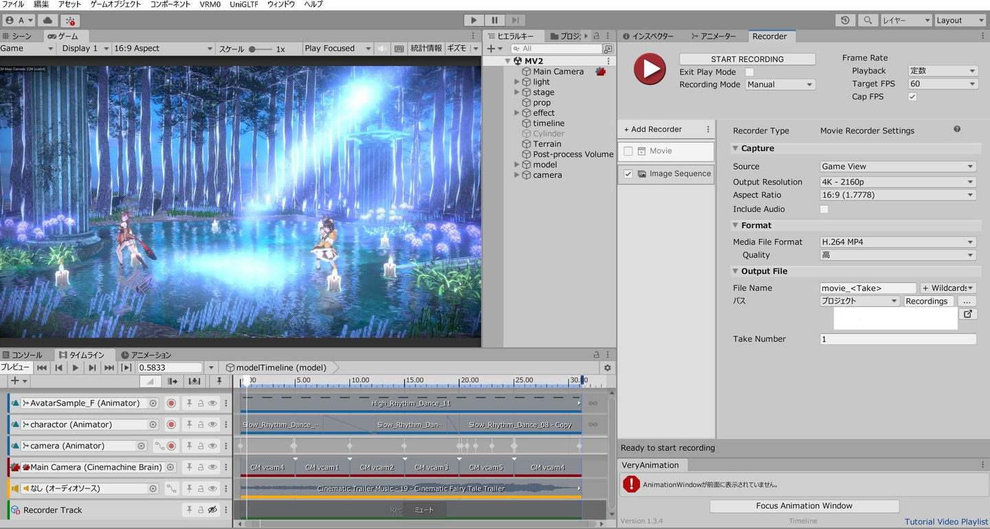 キャラクターにモーションを流し込み、手の埋まりなどをVeryAnimationで修正しています。