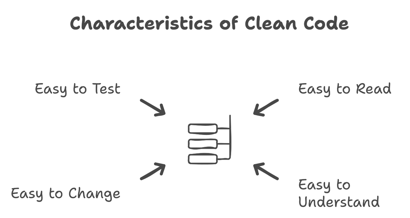 Clean code should not be about being aesthetic and also not about blind obedience to a set or rules; rather, it is an intrinsic way of writing code that is maintainable, readable, and efficient. The four important features of clean code are given in the picture below.
