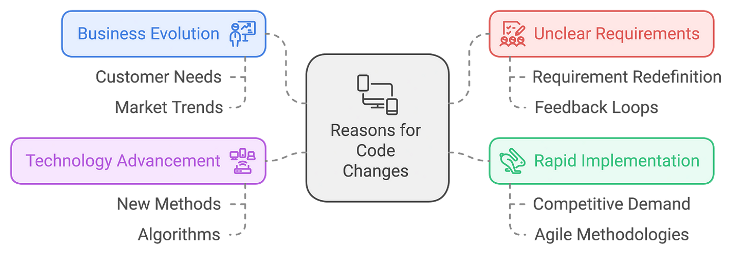 Change in software is inevitable, with technology and business requirements being dynamic. Business growth and shifting customer expectations compel changes in software to accommodate new requirements, regulations, and market demands. Besides, technological advancement keeps introducing new tools, frameworks, methods, and such for which code needs modification for performance, security, or other functionality enhancement purposes. Besides, bugs, unforeseen issues, or user feedback contribute to developers revisiting and refining their solutions so that the software remains effective, efficient, and competitive.