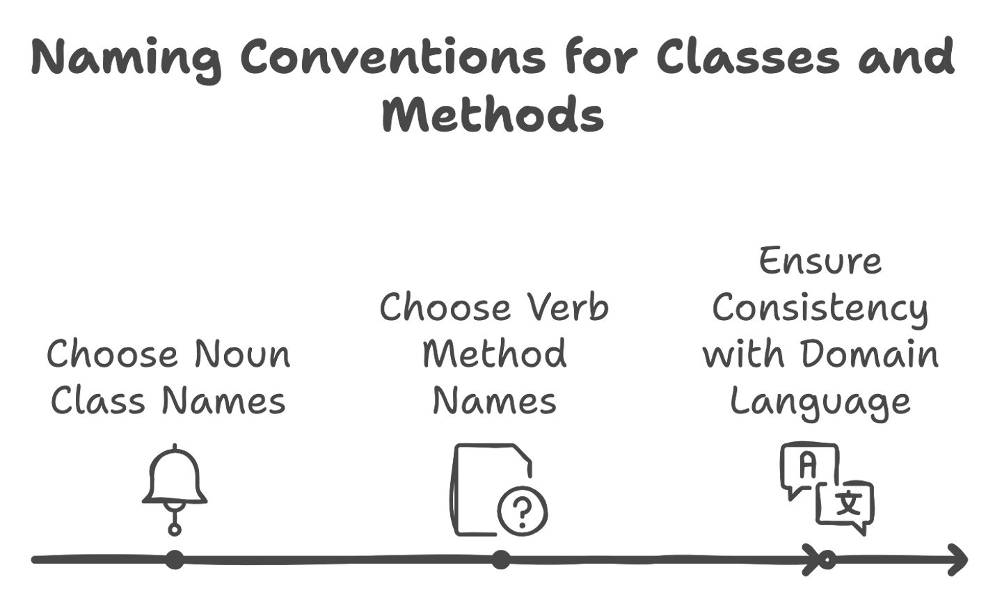 Be Consistent with the Language Domain :Β Class and method names should be chosen in such a way that they are consistent with the terms normally used in the business domain. That way, consistency is ensured, or guaranteed, and the code is bound to be specifically about the domain; therefore, it will be easily readable by those people already conversant with the domain. Examples: βBankAccountβ, βcalculateInterestβΒ for a financial application.