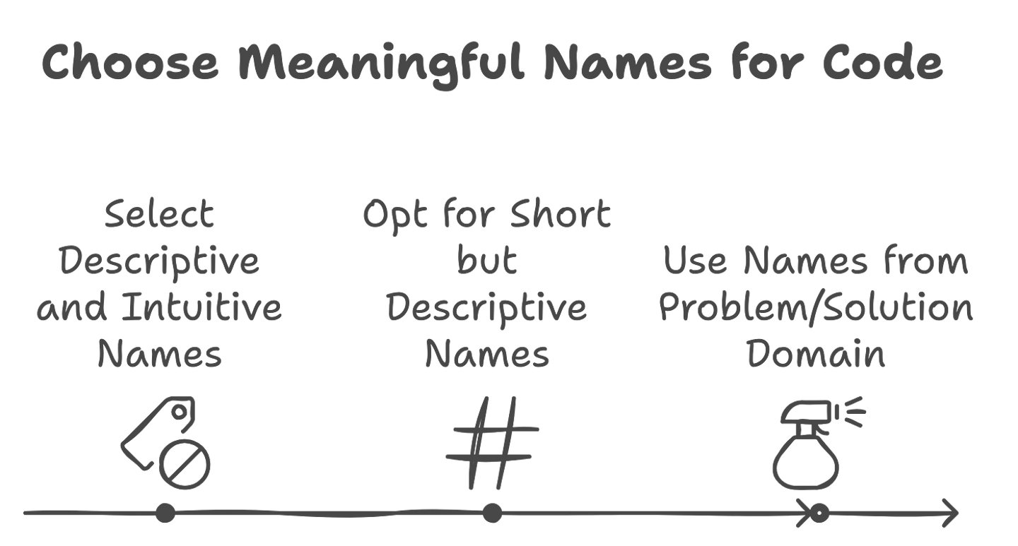 - Use Names from Problem/Solution Domain :Β Choosing names from the problem or solution domain improves understanding. It puts the code into harmony with real-world concepts that it works out, hence making things more intuitive.