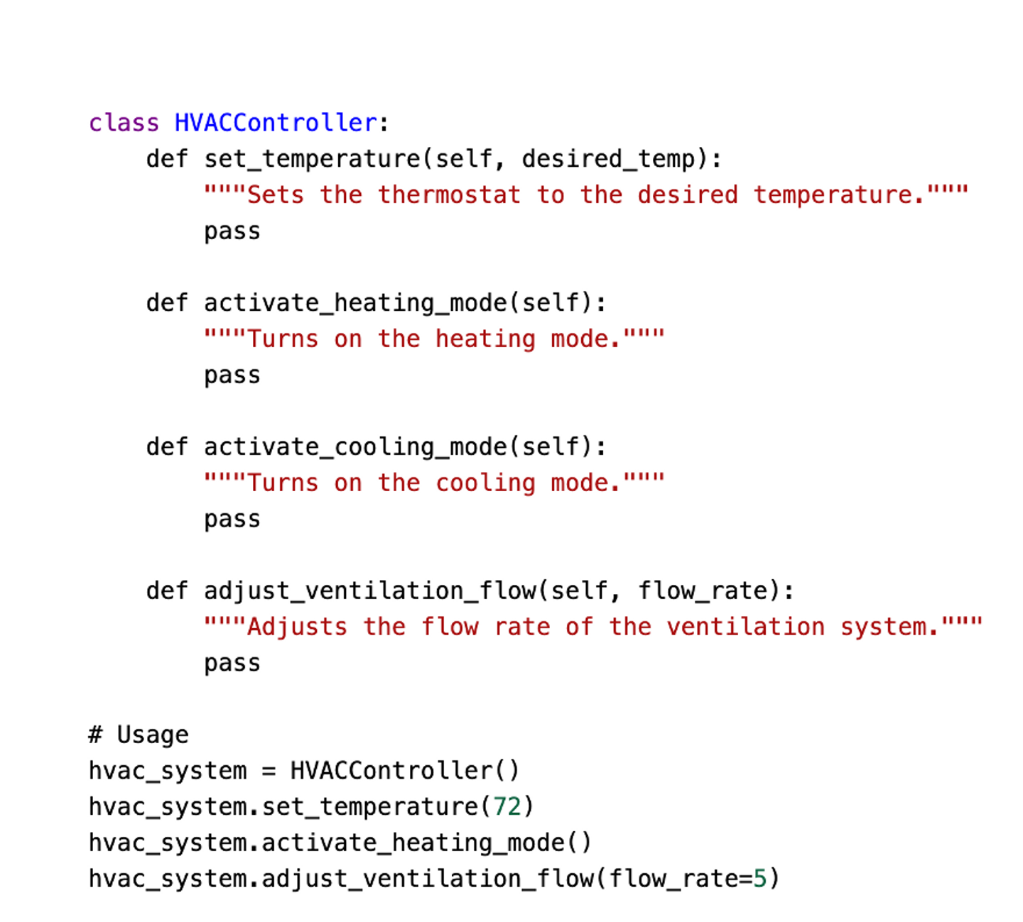Method names should be verbs or verb phrases :Β As methods perform some action, their names should be verbs according to what the method does. Examples will include anything like βset_temperatureβ, βactivate_heating_modeβ, and βcalculateTotalβ. This practice conveys the getting and setting of something that occurs with the method; in fact, it makes the code more readable.