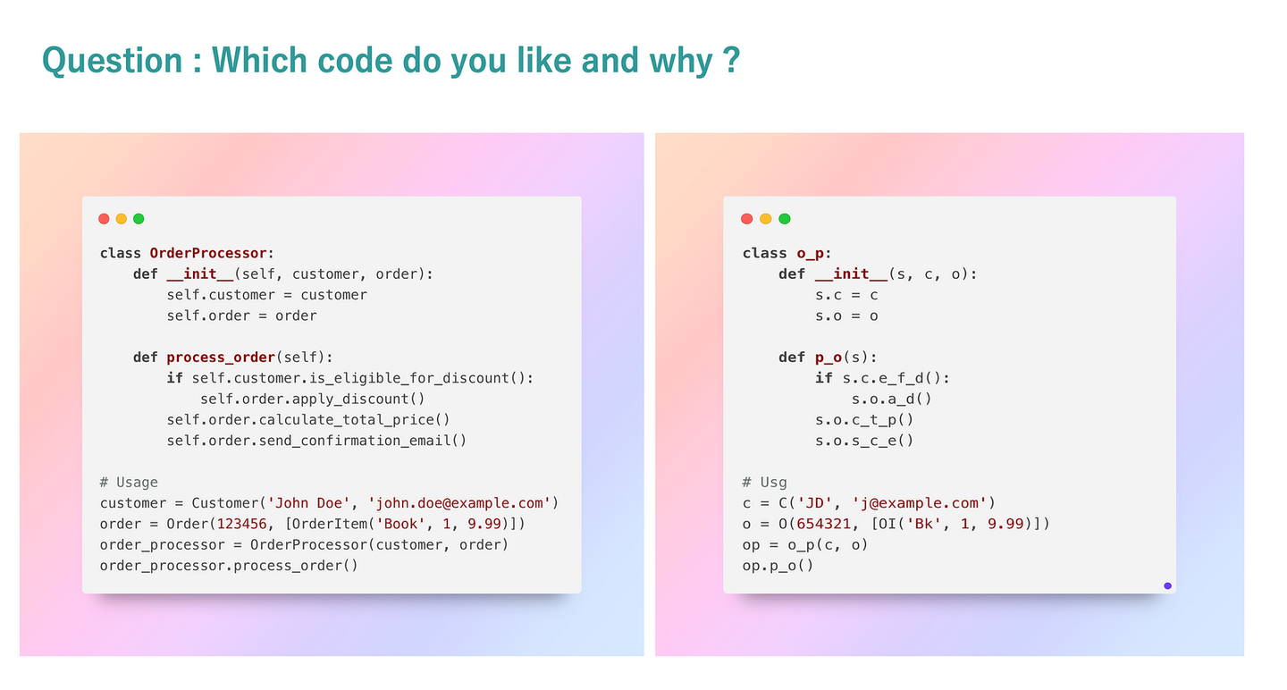 1. Easy to Read:Β Just like well-written prose, using clear names and consistent formatting.