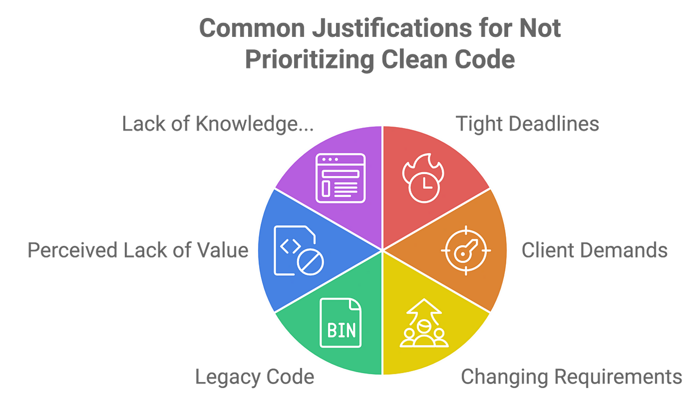 One of the standard reasons developers make compromises concerning clean code practices has to do with very tight deadlines. When there is not sufficient time, a natural urge is to take shortcuts by emphasizing functionality over code quality, hence coming up with quick, though messy, uncontrollable fixes.