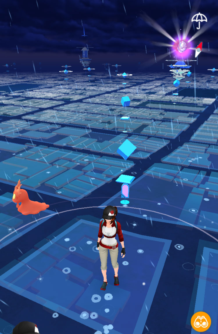 始めて1週間目くらいだったか最初の雨天。ゲーム内でも雨が降っている!と驚く。ローンチ当初からずっとプレイしている友人が教えてくれたのだが、天候によって出現するポケモンの種類も違うとのこと。その後、ポケモンを集めていくうちに気づいたが、ポケモンの種類(属性)によって戦闘能力にも補正ボーナスが付いている。